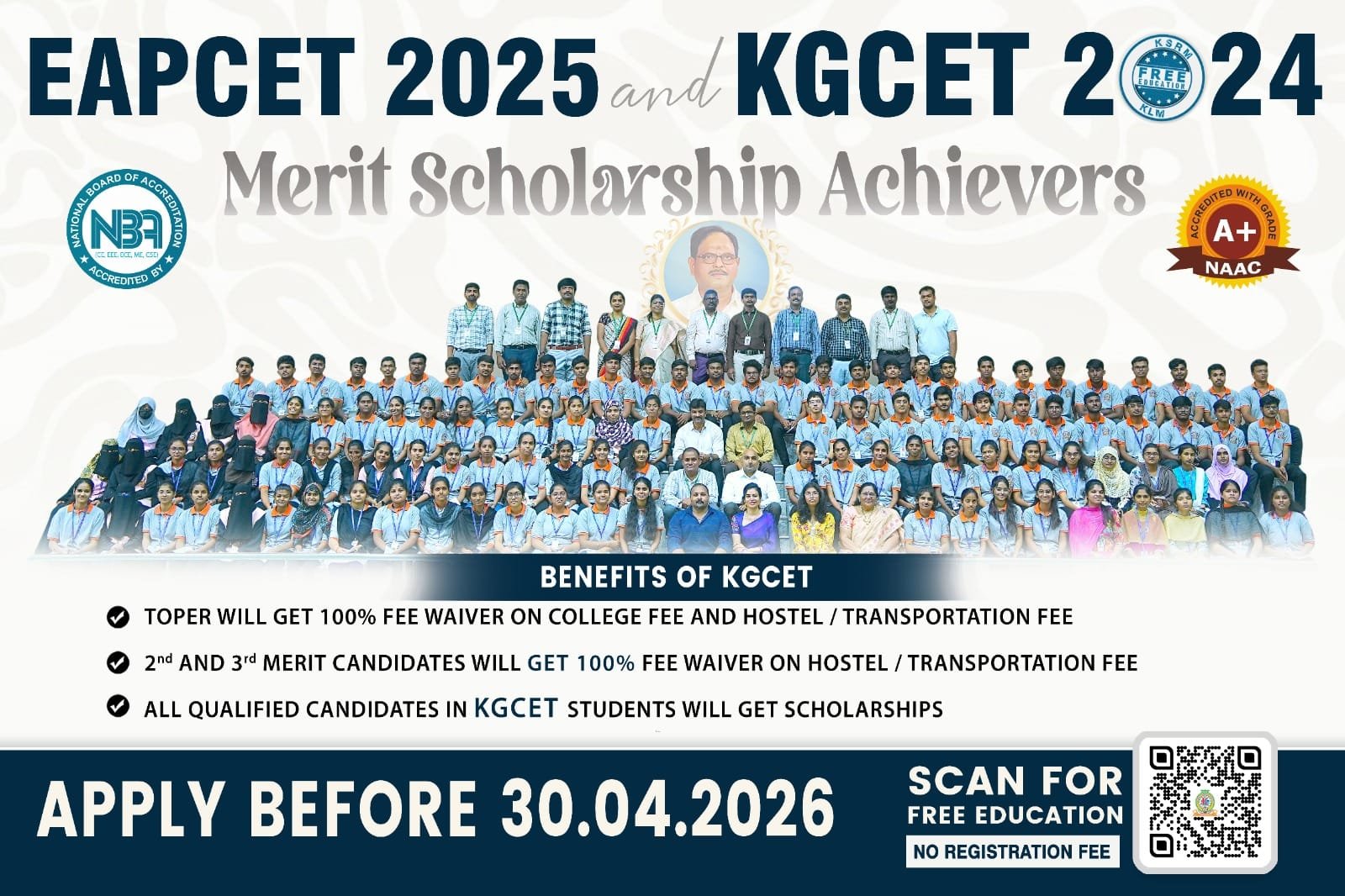 Candidates qualified in KGCET and admitted in KSRMCE through EAPCET / Management Quota will be provided scholarships every year ranging from Rs.6,000/- to Rs.50,000/- based on marks obtained in KGCET.