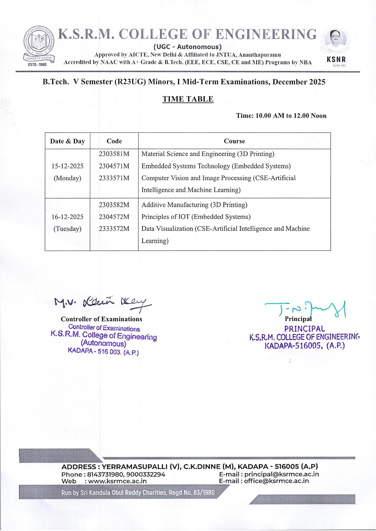 Minor Time Tables - V Sem II Mid Exams, Dec-25