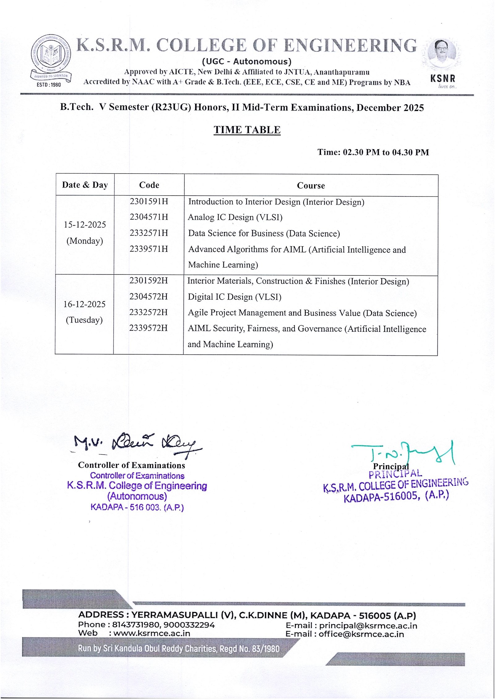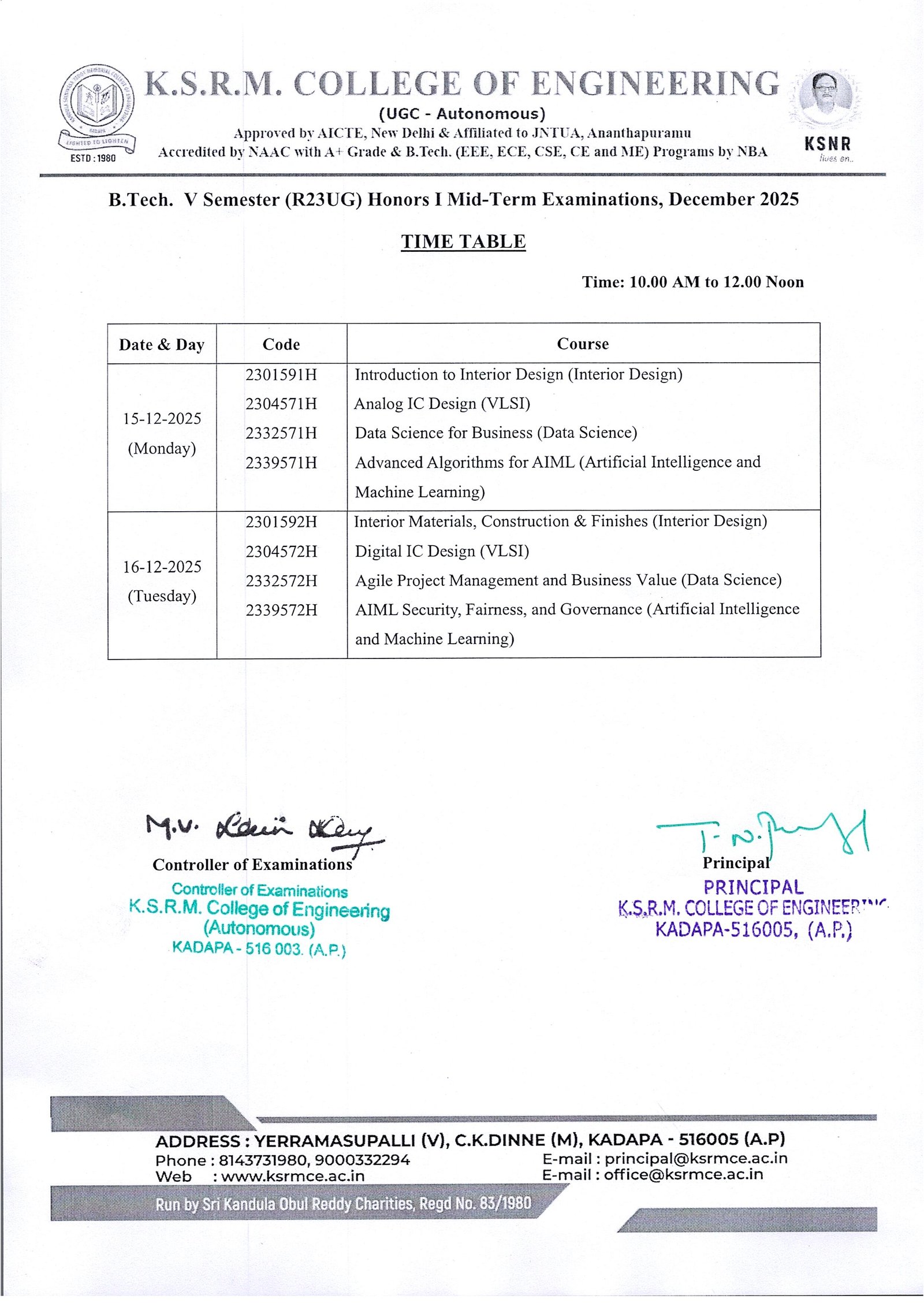 Honor Time Tables - V Sem II Mid Exams, Dec-25
