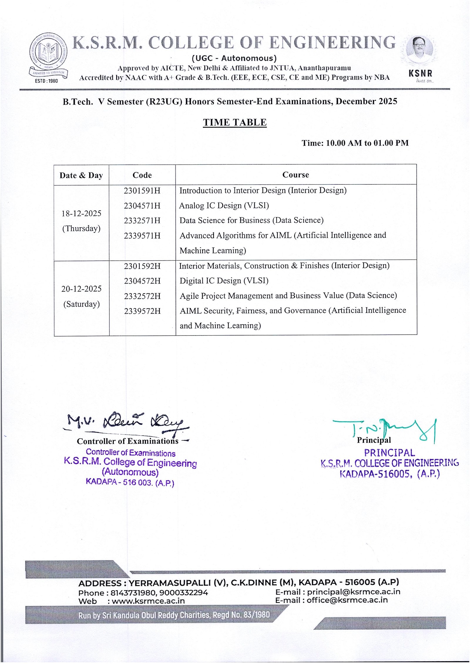 HonorTime Tables - V Sem End Exams, Dec-25