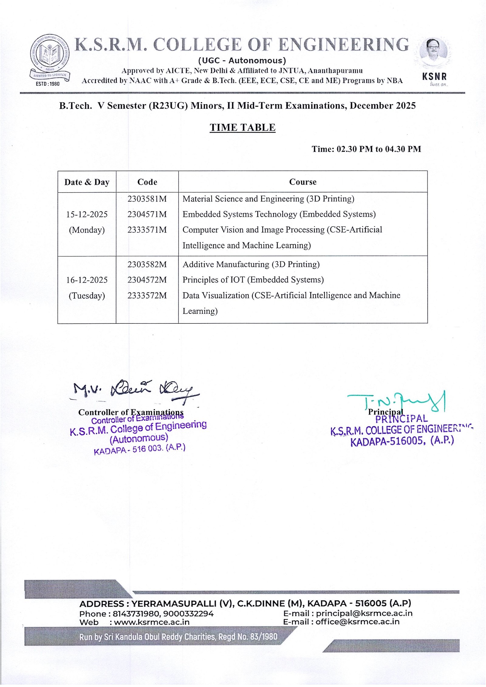 Minor Time Tables - V Sem II Mid Exams, Dec-25